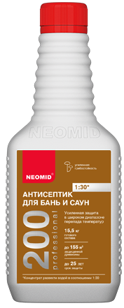 Антисептик для бань и саун NEOMID 200 концентрат 1:30 – антисептическая пропитка для защиты древесины внутри бань и саун, включая полки и скамейки, в условиях частого перепада температур и повышенной влажности.
