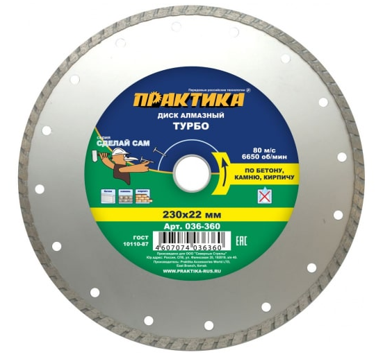Брал у вас в магазине "Материк" диск алмазный турбо от "Практики". Хорошая цена и отлично режет. Приличное качество и износостойкость диска. Советую!