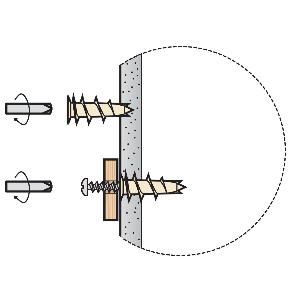 Ввинчивается непосредственно в основание и поэтому не требует предварительного сверления. После этого устанавливается закрепляемый материал, и в анкер вворачивается винт.