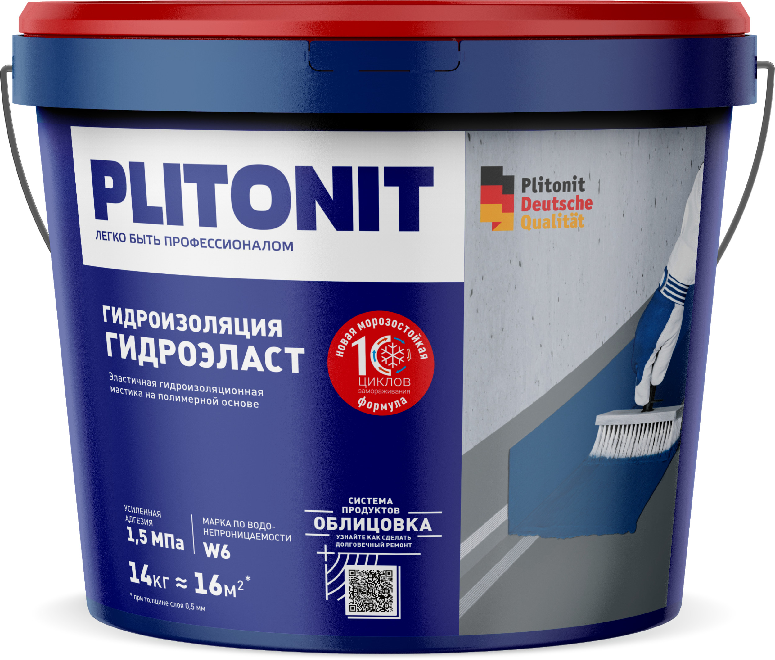 Гидроизоляция Плитонит ГидроЭласт – эластичная гидроизоляционная мастика на основе полимеров, готовая к использованию. Данный материал незаменимая вещь в качественной, бесшовной гидроизоляции как внутри, так и снаружи помещений. Особенно актуально использование мастики в ванных, туалетах, душевых, где необходима долговечная защита невлагостойких покрытий от воды и влажного воздуха. Материал не имеет запаха, очень удобен в использовании.