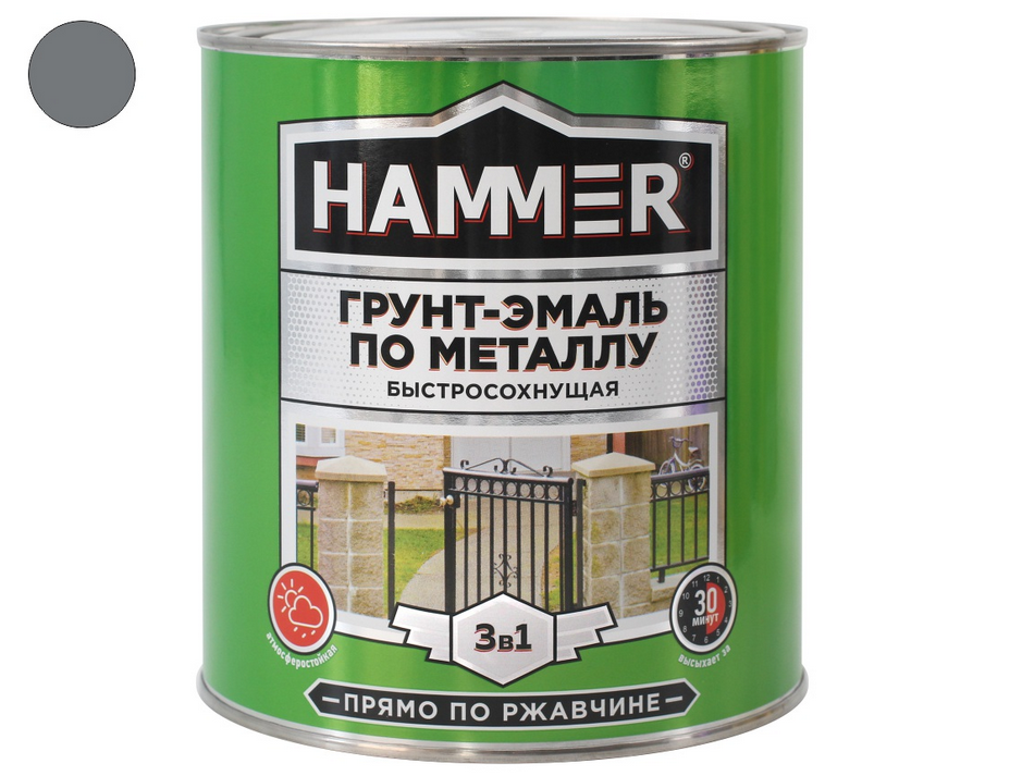 Грунт-Эмаль по металлу Хаммер, предназначена для защиты и создания декоративного покрытия на стальных и чугунных поверхностях с остатками оскалины и плотно державшейся ржавчины, подвергающихся воздействию атмосферы, солей и других химических реагентов.