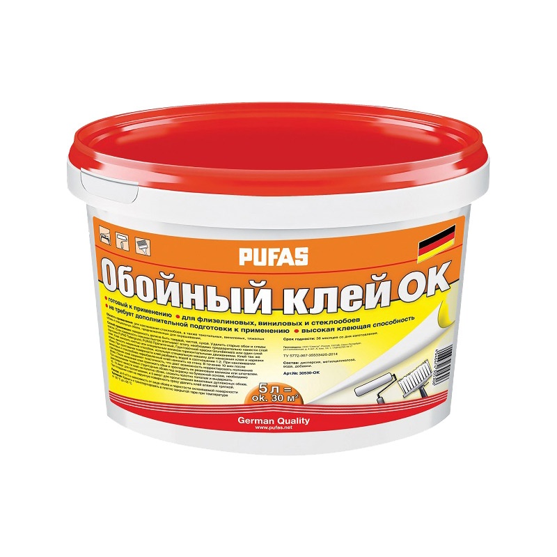 Готовый к применению клей Pufas- применяеся для приклеивания всех видов обоев. (Виниловых, флизелиновых, стекловолокнистых и т.п)