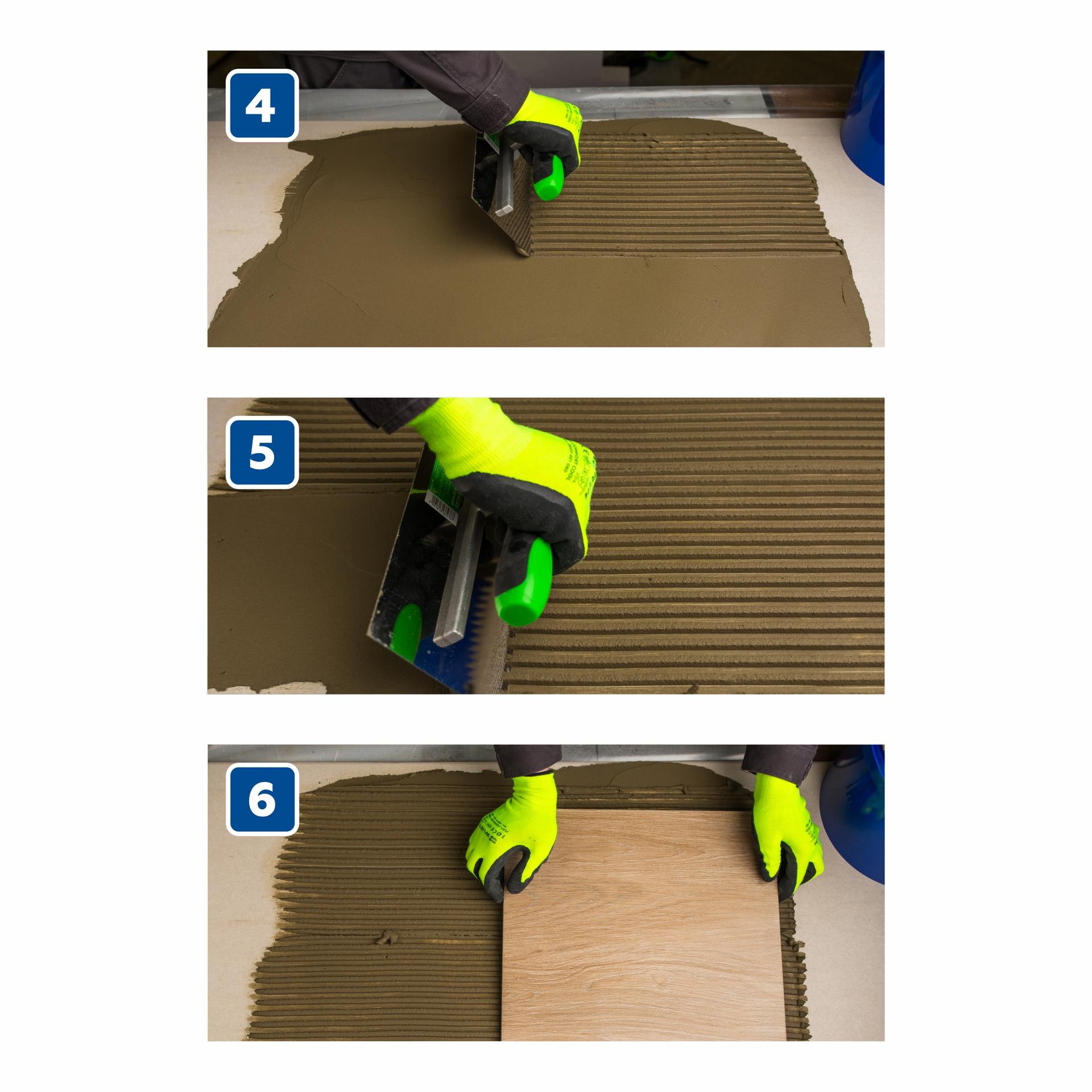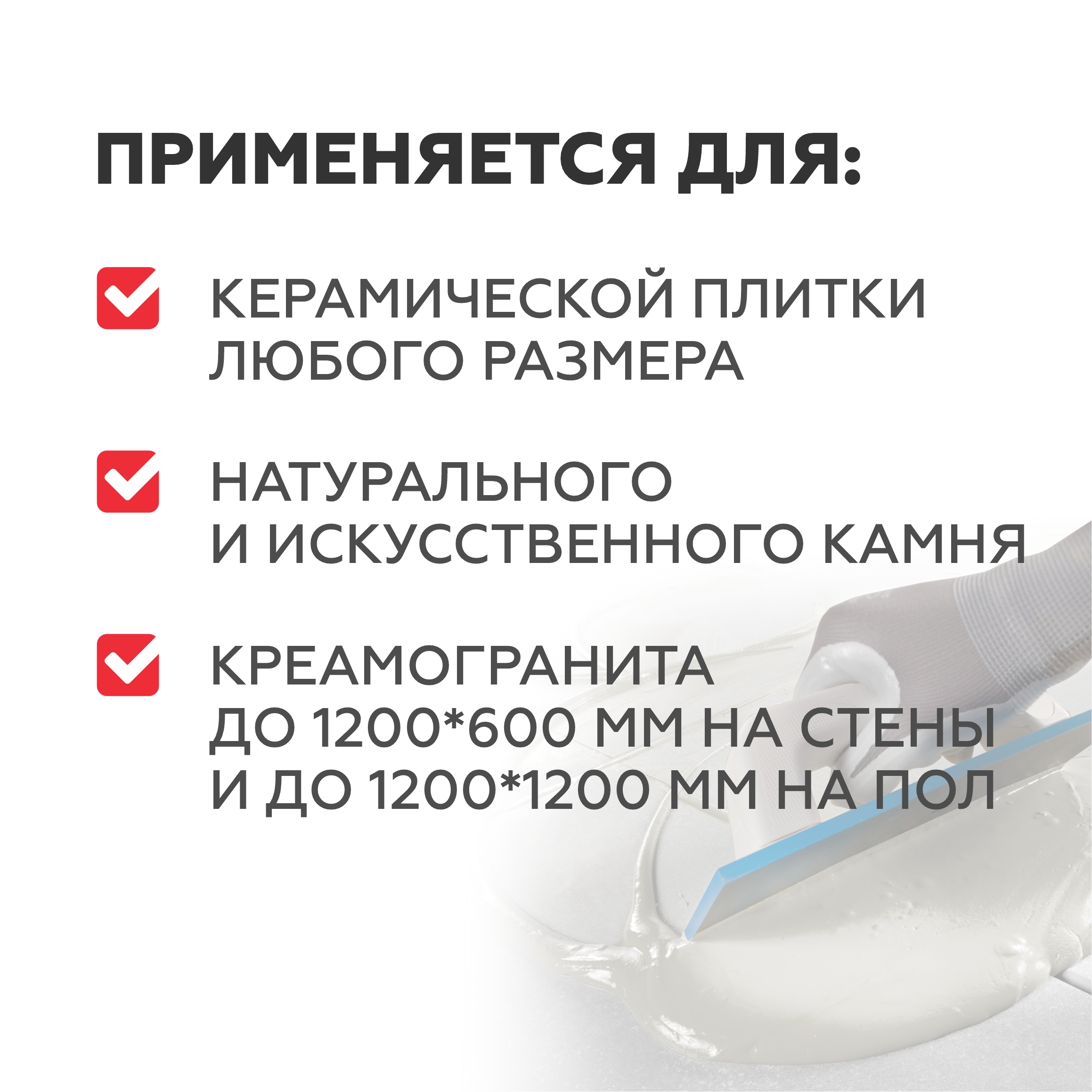 Готовую растворную смесь равномерно нанести на основание с помощью гладкого шпателя и придать гребенчатую структуру зубчатым.Растворную смесь следует нанести на такую площадь, которую можно облицевать плиткой в течение 30 минут. Плитка укладывается с открытыми швами с выравниванием соответствующими приспособлениями. При облицовке бассейнов, фасадов, террас, балконов, полов с подогревом, а также плиток с высотой рельефа тыльной стороны более 2 мм или размером более 30х30 см, во избежание пустот под плиткой и для увеличения прочности сцепления, необходимо наносить клей комбинированным способом. На тыльную сторону плитки, клей сначала наносится зубчатым шпателем, а потом гладким шпателем равномерно разравнивается по всей площади плитки. Расход материала при комбинированном способе увеличивается на 1,3 кг/м? при толщине слоя 1 мм.