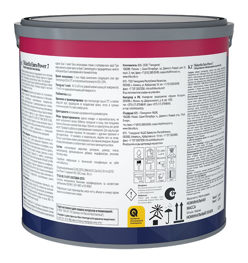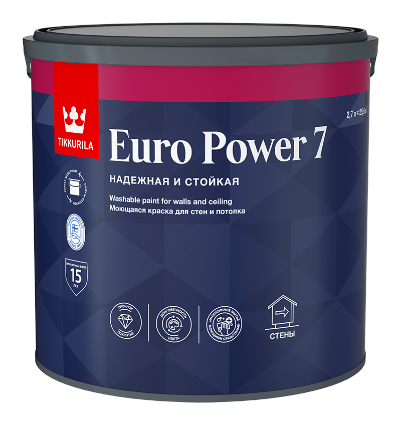 Водоразбавляемая латексная краска EURO POWER 7 для окраски стен и потолков в помещениях с нормальной и повышенной влажностью, относится к линейке Евро.