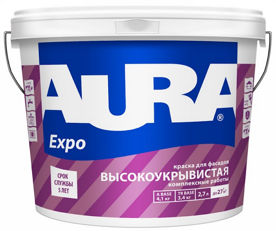 Aura Facad Expo хорошая фасадная краска.Удобна в использовании, быстро сохнет.