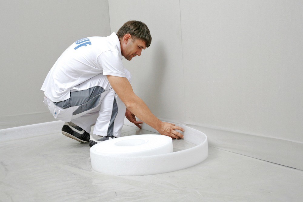 Демпферная лента КНАУФ выполняет роль компенсатора напряжений между конструкцией сухого сборного пола из гипсоволокнистых листов и стенами здания. Изоляция выполняет функции теплоизоляции, ограничивая потери тепла через стены здания, и предотвращает выдавливание керамзита из под элементов сборного пола.