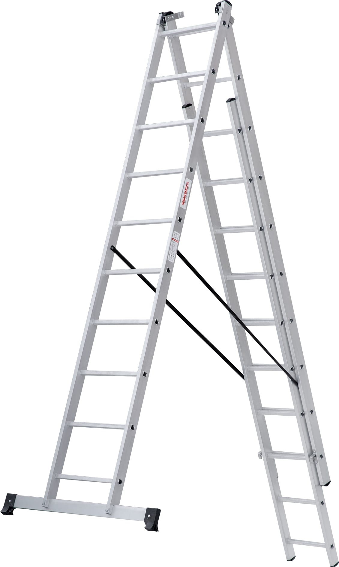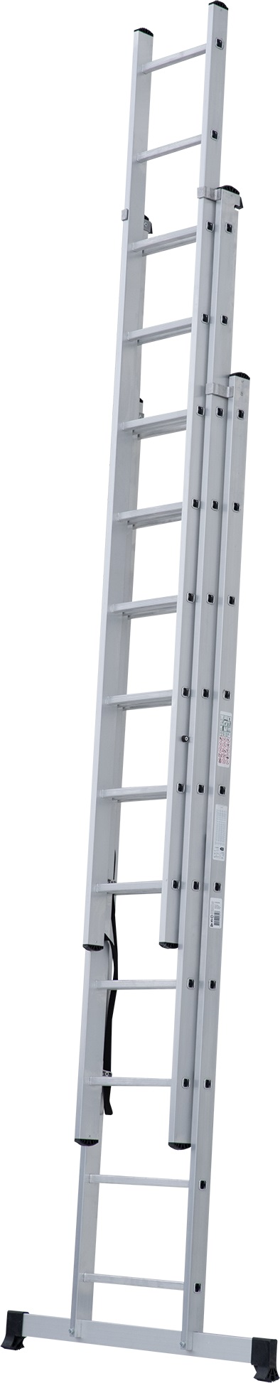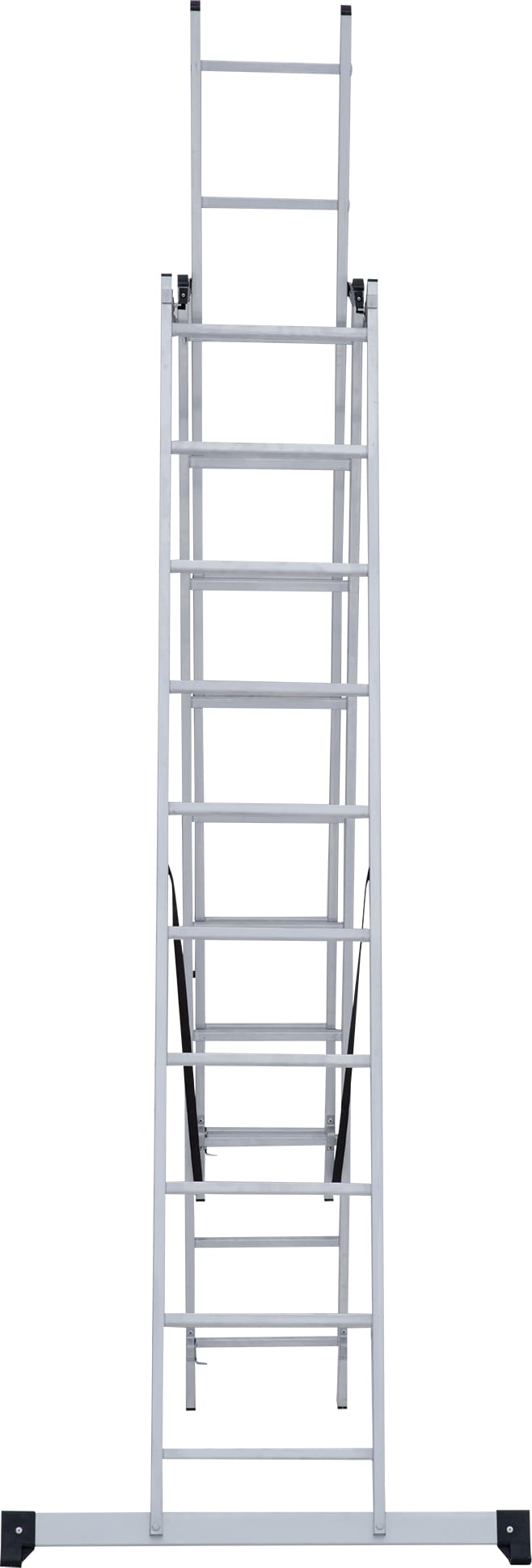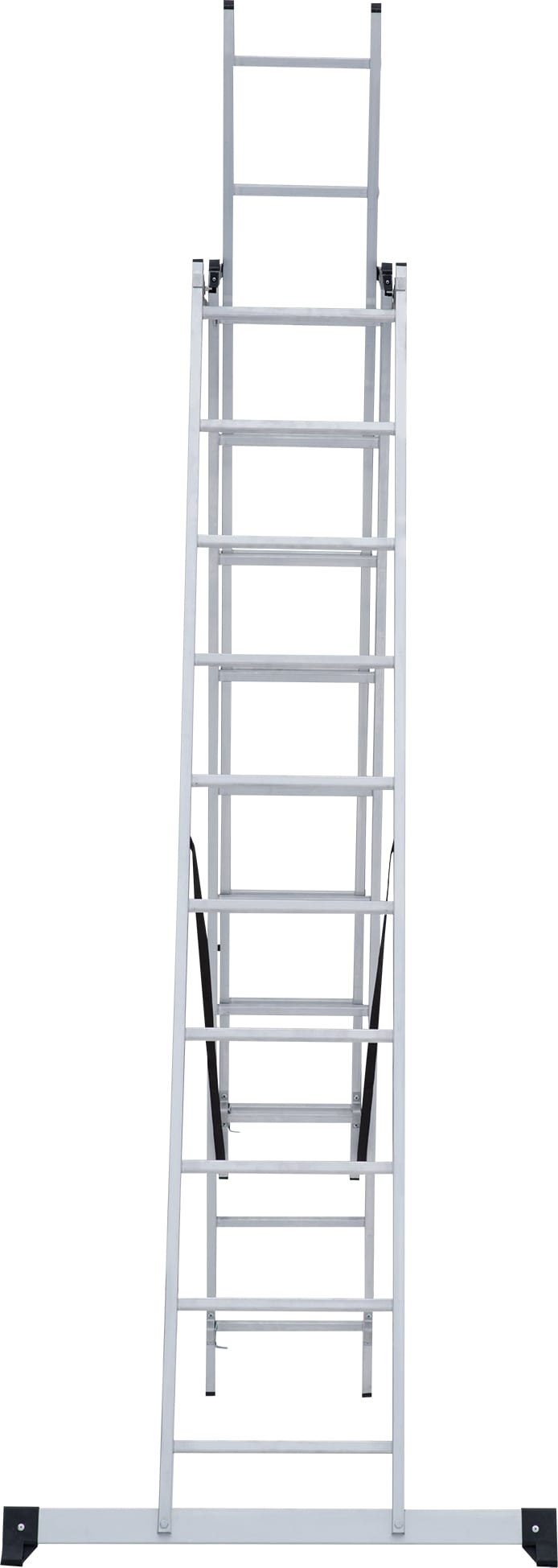 Лестница трехсекционная – это универсальная лестница, которая может использоваться в разных режимах: как приставная, раздвижная, двухсторонняя стремянка, стремянка с выдвижной секцией и лестничный марш.