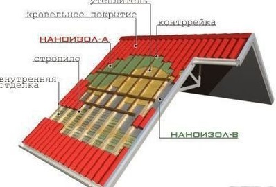 Использование НАНОИЗОЛ А в качестве гидроизоляционной мембраны связано с рядом важных особенностей при монтаже. Материал НАНОИЗОЛ А раскатывается перпендикулярно или параллельно стропилам снаружи кровли с перехлестом 10-15 см, гладкой стороной наружу. Материал укладывается с обязательным провисом 2-2,5 см между стропилами при этом важно обеспечить необходимый зазор между мембраной и утеплителем (не менее 2,5-3см). Для этого на стропила набивается дополнительный брус, либо изначально устанавливаются стропила выше планируемого слоя теплоизоляции на 5 см. Между коньком крыши и полотнищами также необходимо оставить зазор 5-8 см, обеспечив тем самым беспрепятственный поток воздуха по нижнему вентиляционному зазору. Не допускается применять скобы без установленной деревянной рейки поверх мембраны в местах креплений. НАНОИЗОЛ А обязательно крепится контробрешеткой, она же обеспечивает верхний вентиляционный зазор. Для фиксации реек применяются гвозди или саморезы. По контробрешетке монтируется обрешетка или сплошной настил в зависимости от типа кровельного покрытия. В местах перехлеста полотен и местах примыкания к элементам конструкций допускается проклейка соединительными лентами. Нельзя допускать соприкосновения материала НАНОИЗОЛ А с утеплителем, и категорически не допускается использование НАНОИЗОЛ А на кровлях с уклоном менее 35 о, так как это приводит к снижению гидроизолирующей способности материала. Нижняя кромка должна обеспечивать естественный сток влаги с поверхности мембраны в водосточный желоб. Для выветривания водяного пара и конденсата необходимо обеспечить надлежащую вентиляцию обоих вентиляционных зазоров, т.е. обеспечить свободный проход воздуха в вентиляционных зазорах, перекрытие мест движения воздуха не допускается. Для этого в нижней части крыши и в районе конька предусматриваются вентиляционные отверстия для циркуляции воздуха