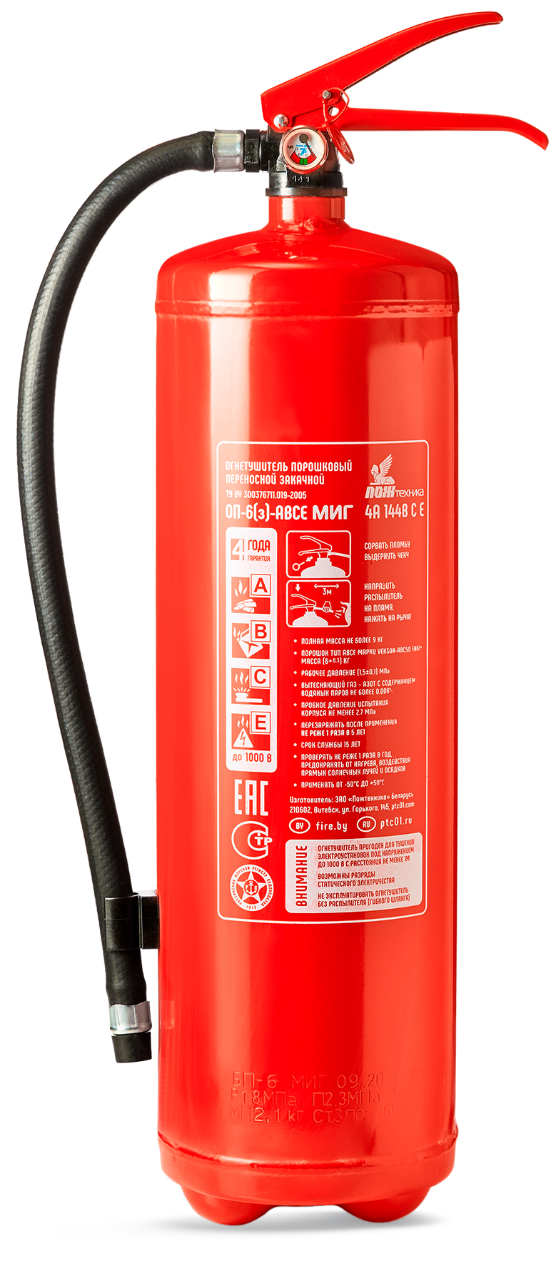 Огнетушитель ОП-6 МИГ - Порошковый огнетушитель, заряжаются высококачественным огнетушащим порошком «Вексон АВС-25». Это самый признанный и востребованный порошок для зарядки огнетушителей в странах СНГ, который применяется во всех климатических зонах при температуре окружающей среды от минус 50 до плюс 50 С.