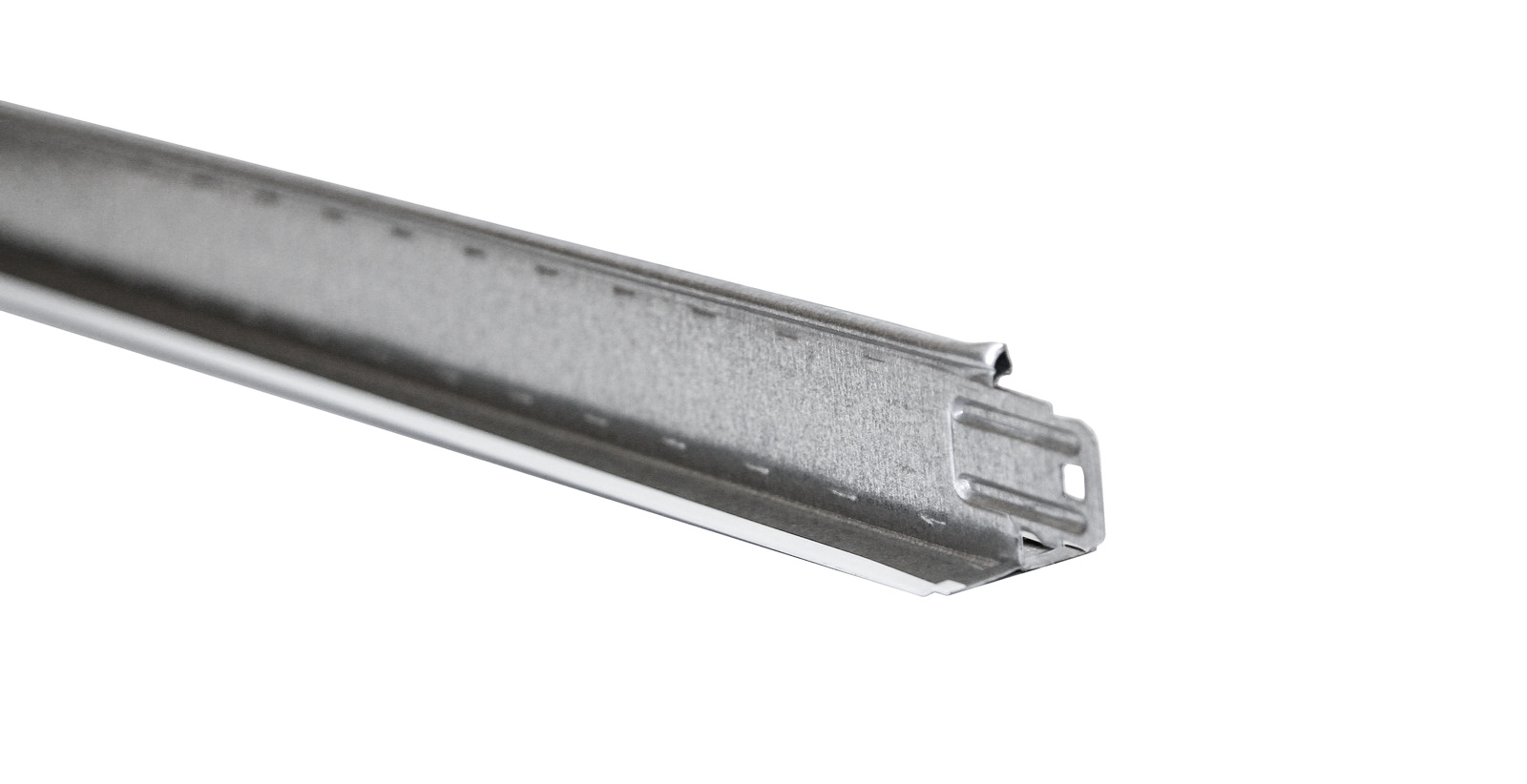 - Монтаж основных несущих направляющих длиной 3600мм. Профили 3,6 закрепляются на предварительно смонтированные подвесы. Шаг между основными направляющими составляет 1200мм. По длине несущие направляющие соединяются между собой замками на торцах направляющих.