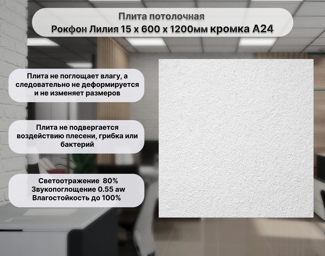 Идеально подходят для стандартных решений подвесных потолков, обеспечивая при этом хорошее звукопоглощение. Rockfon Lilia - это плита с гладкой поверхностью белого цвета,без использования стеклоткани на задней поверхности панели. Подвесной потолок Лилия обладает рядом преимуществ: