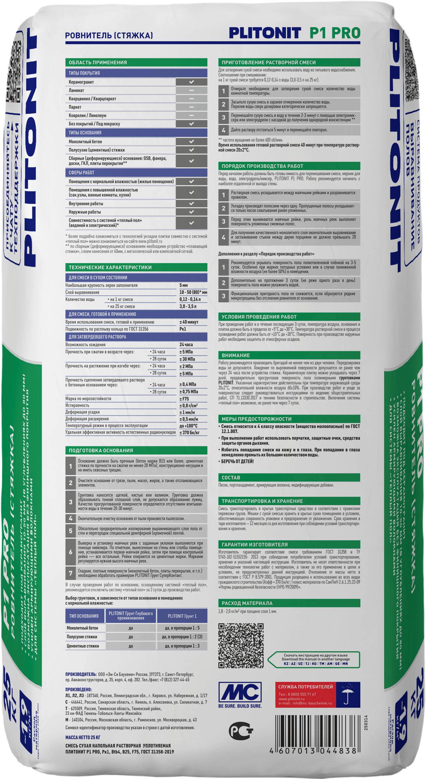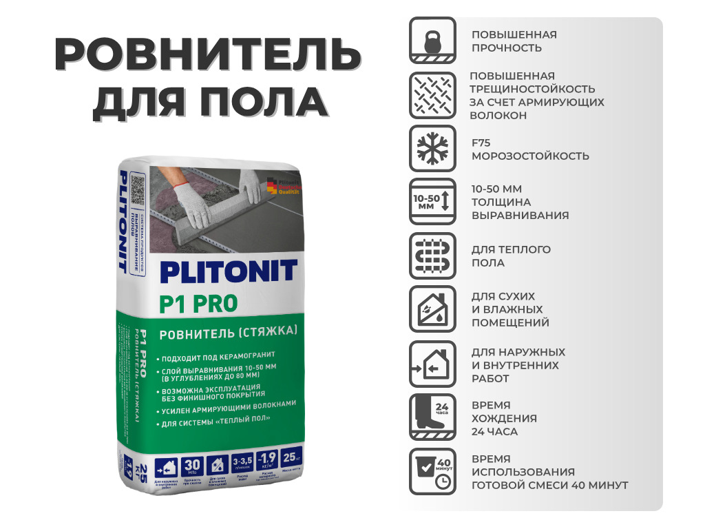 Ровнитель ПЛИТОНИТ Р1 pro для пола 10-50мм 25кг – сухая строительная смесь на цементной основе с модифицирующими добавками и армирующими волокнами, применяемая для предварительного выравнивания бетонных полов и монолитных цементных стяжек под укладку напольных покрытий. Используется для выравнивания полов под укладку напольной керамической плитки, выстилающих покрытий и паркета. Также ровнитель ПЛТИНИТ Р1 про применяется как основа для нанесения самовыравнивающихся смесей ПЛИТОНИТ, в системе «теплый пол» при проведении внутренних и наружных работ. Возможно использование выровненного основания без монтажа дополнительных напольных покрытий, допускается окраска специальными красками по бетону.