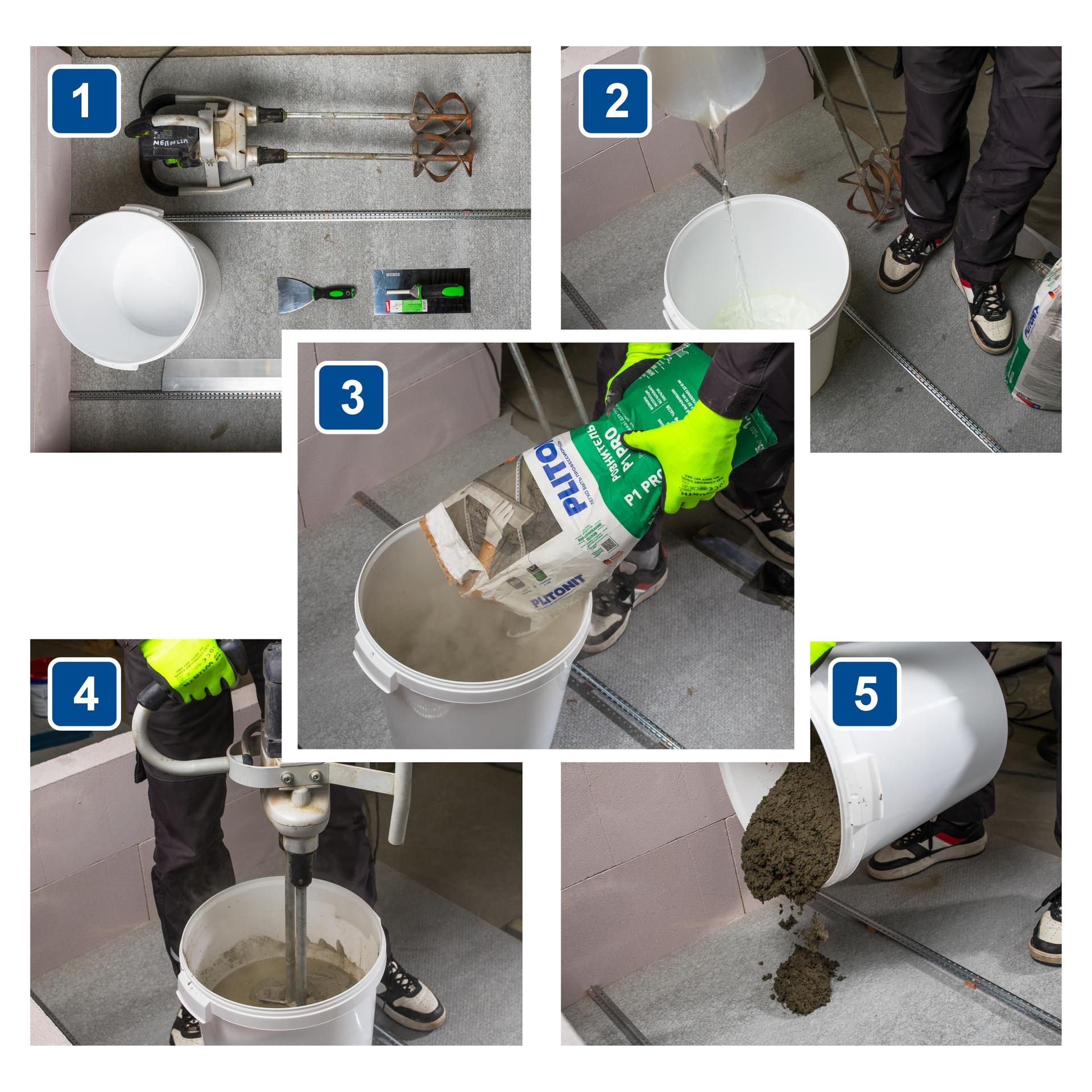 - В заранее приготовленную емкость с водой засыпьте сухую смесь и перемешивайте в течение 3 минут с помощью электромиксера или электродрели с насадкой, соблюдая частоту вращения на уровне –не более 600 об/мин до получения однородной консистенции