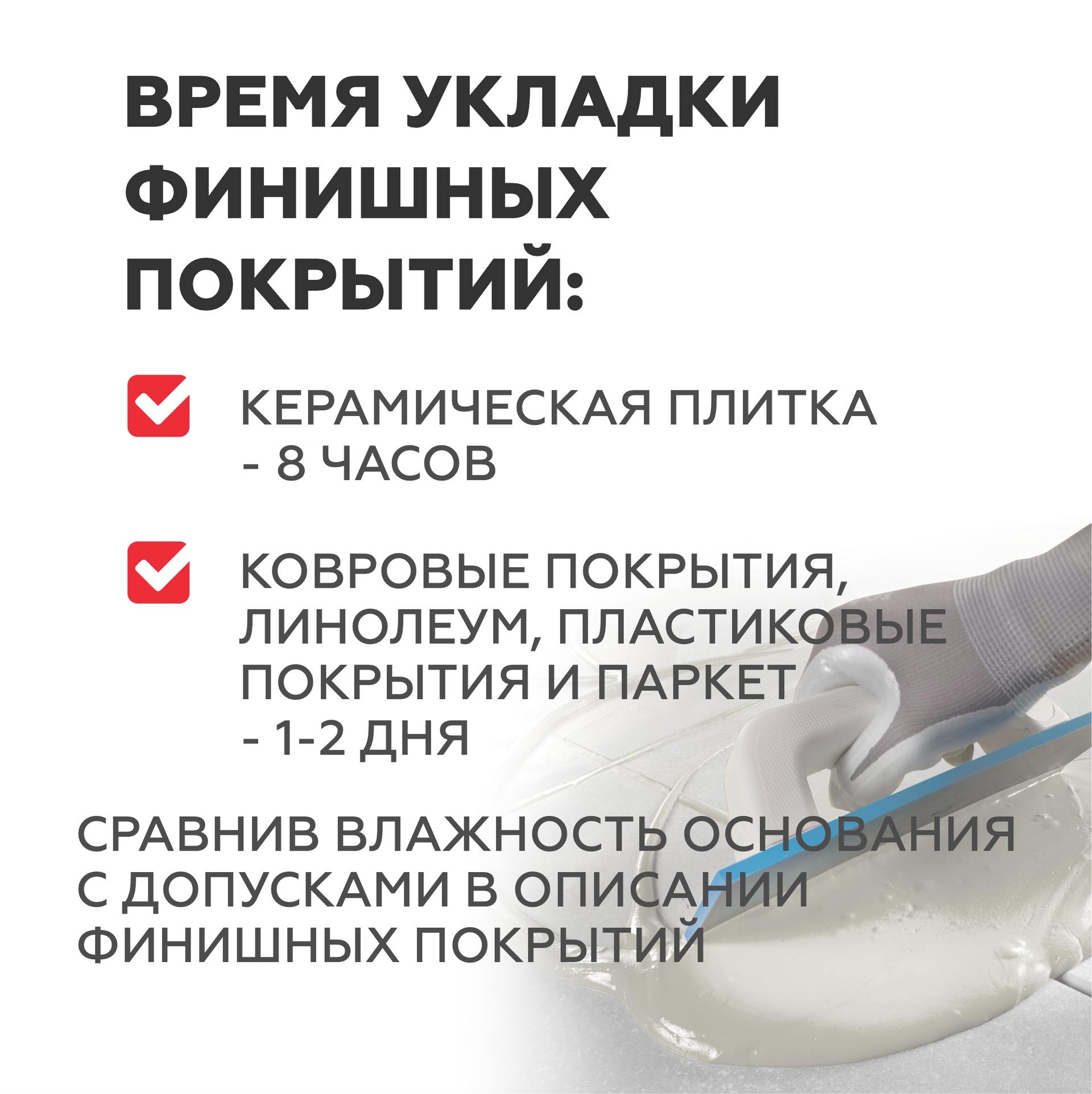 Керамическую плитку можно укладывать через 8 часов, ковровые покрытия и линолеум, пластиковые покрытия и паркет можно укладывать примерно через 1-2 дня, сравнив влажность основания с величиной допускаемой инструкцией производителя напольного покрытия.