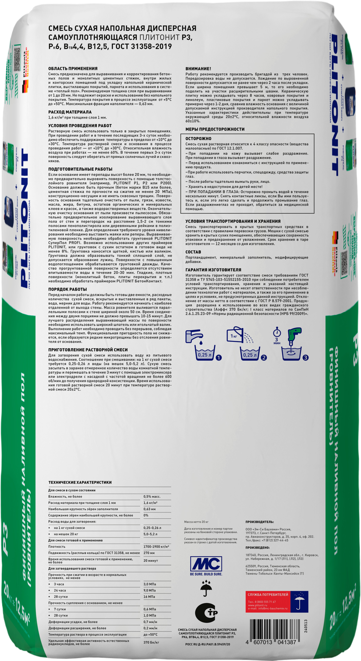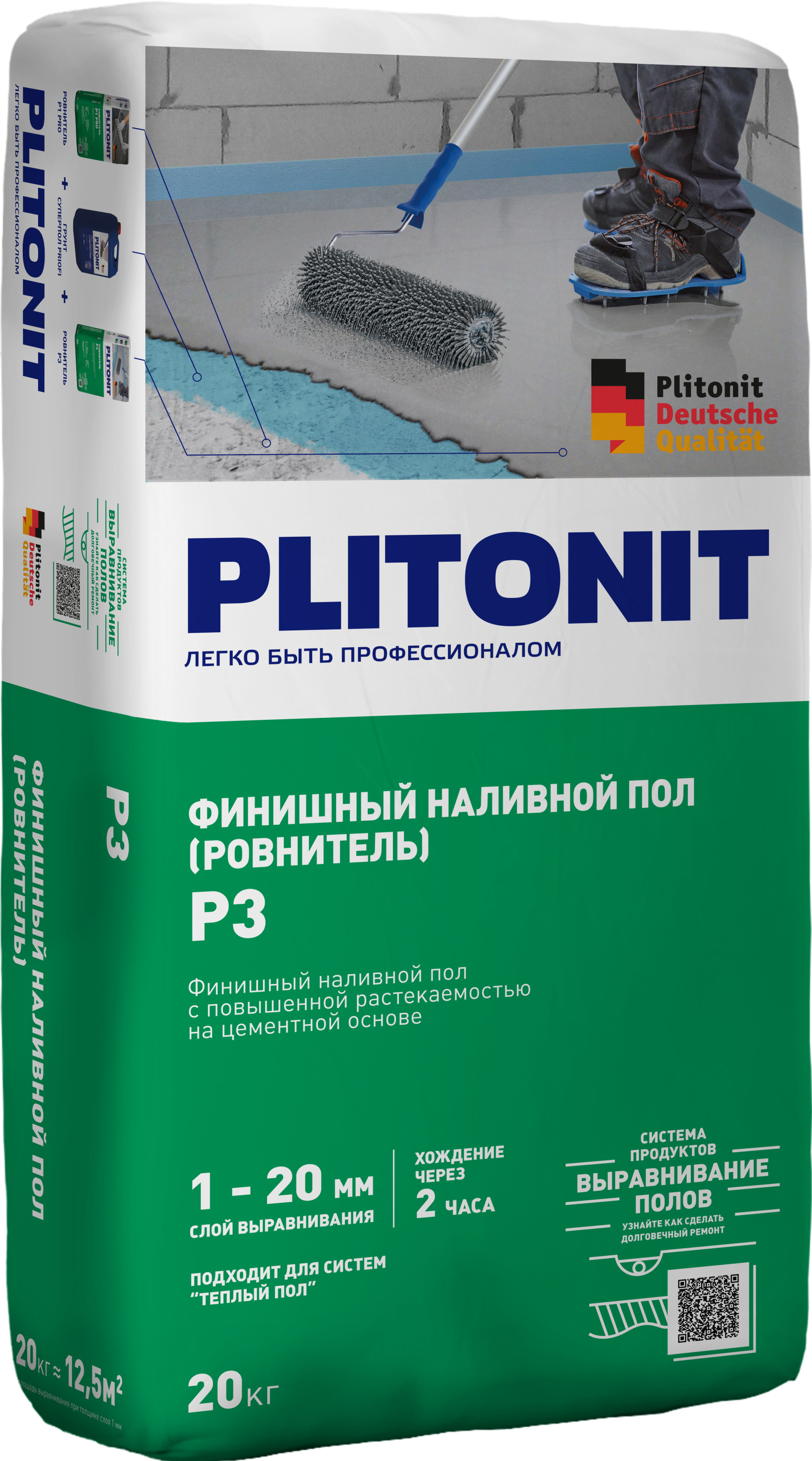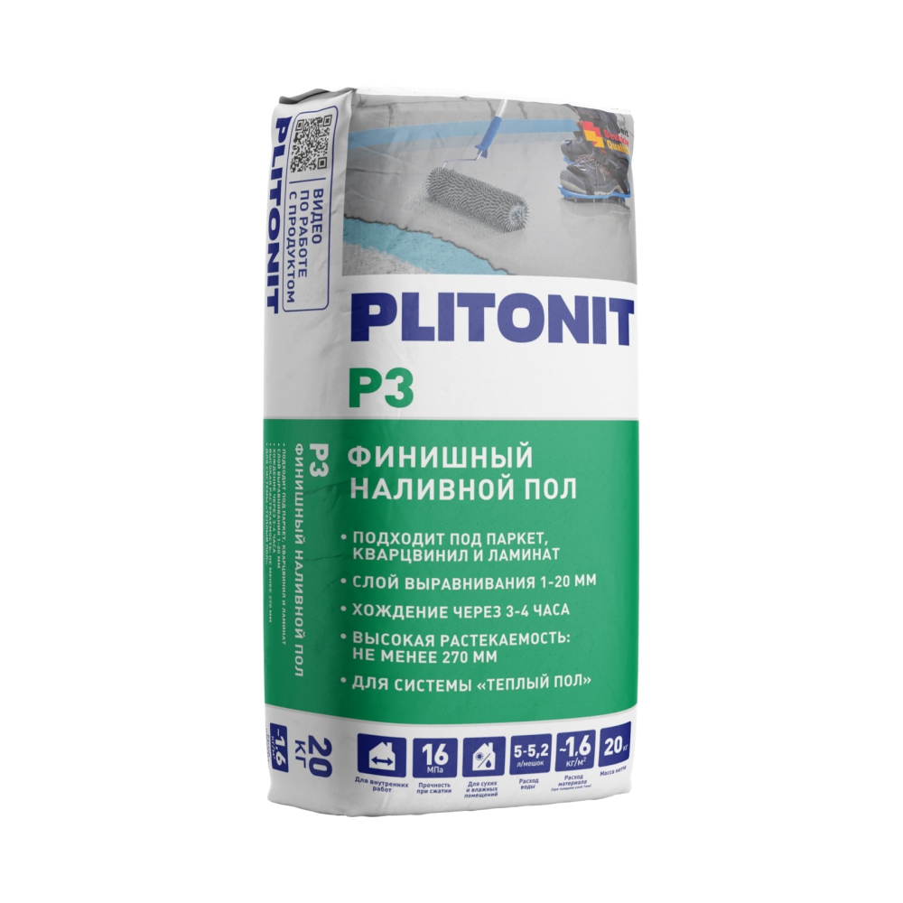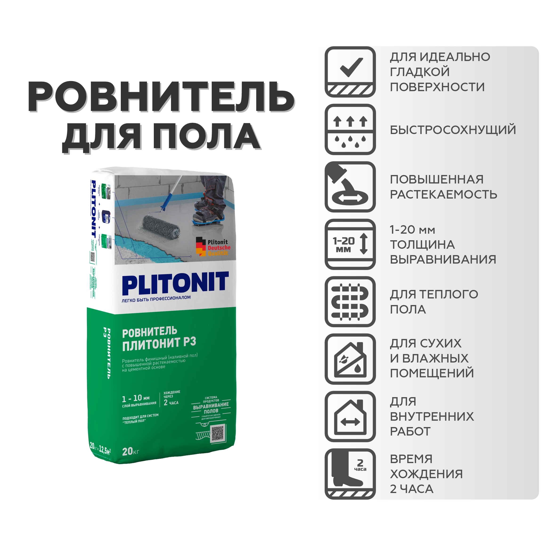 Ровнитель Плитонит Р3 для пола быстротвердеющий самовыравнивающийся 1-20мм 20кг – сухая строительная смесь, применяемая для предварительного выравнивания бетонных полов и монолитных цементных стяжек под укладку напольных покрытий. Используется для выравнивания полов под укладку напольной керамической плитки, выстилающих покрытий и паркета при внутренних работах в помещениях с нормальной нагрузкой – в жилых помещениях, в офисах. Также допускается использование ровнителя ПЛИТОНИТ Р3 в системе «теплый пол».