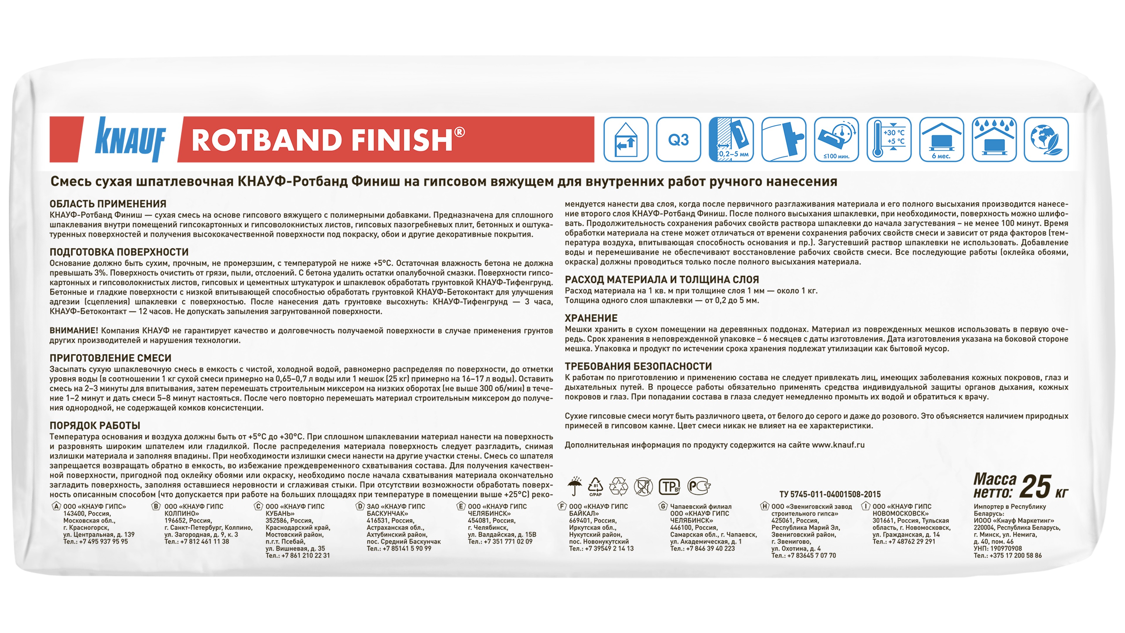 Шпаклевка КНАУФ Ротбанд финиш гипсовая 25кг - сухая шпаклевочная смесь на основе гипса и полимерных добавок.