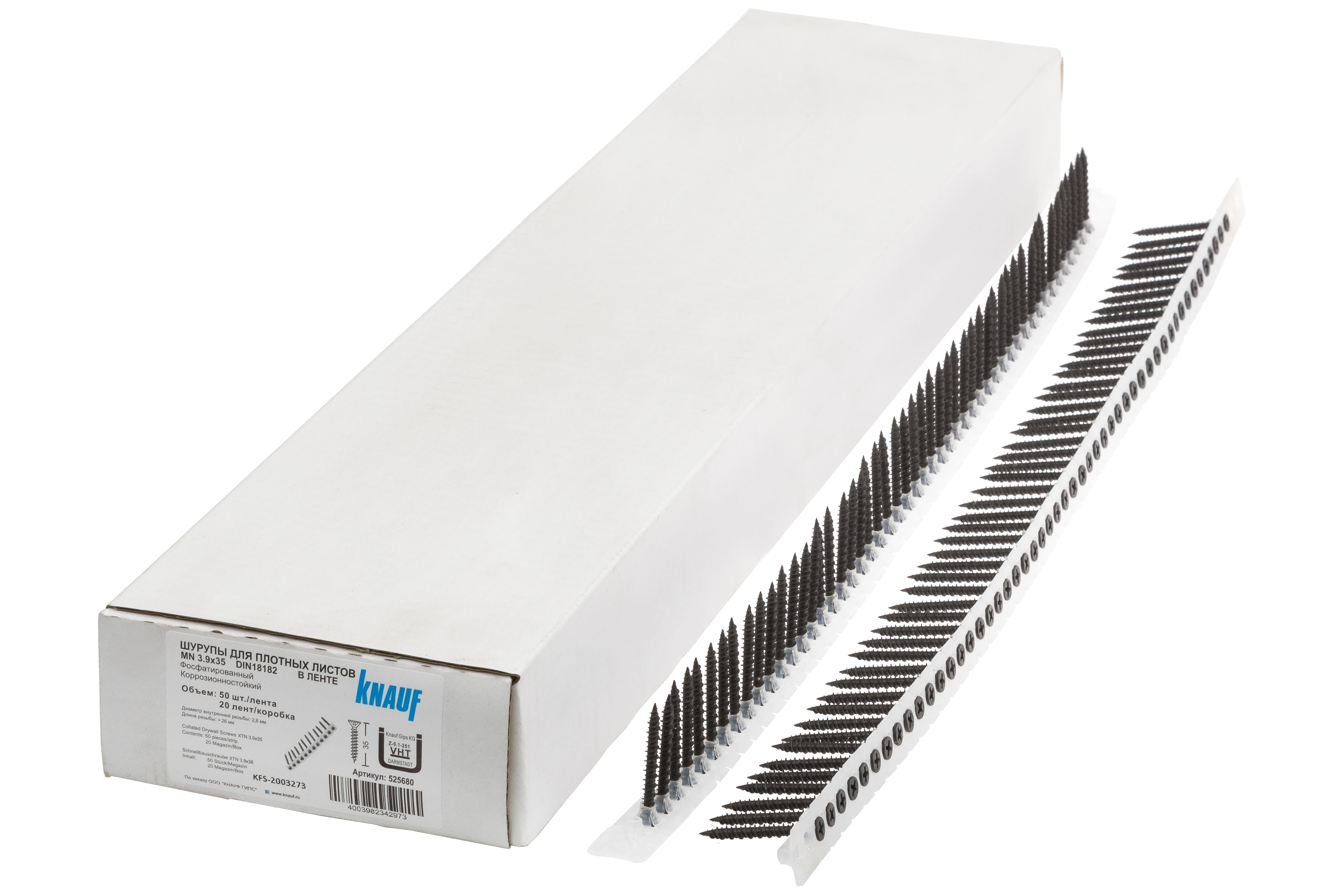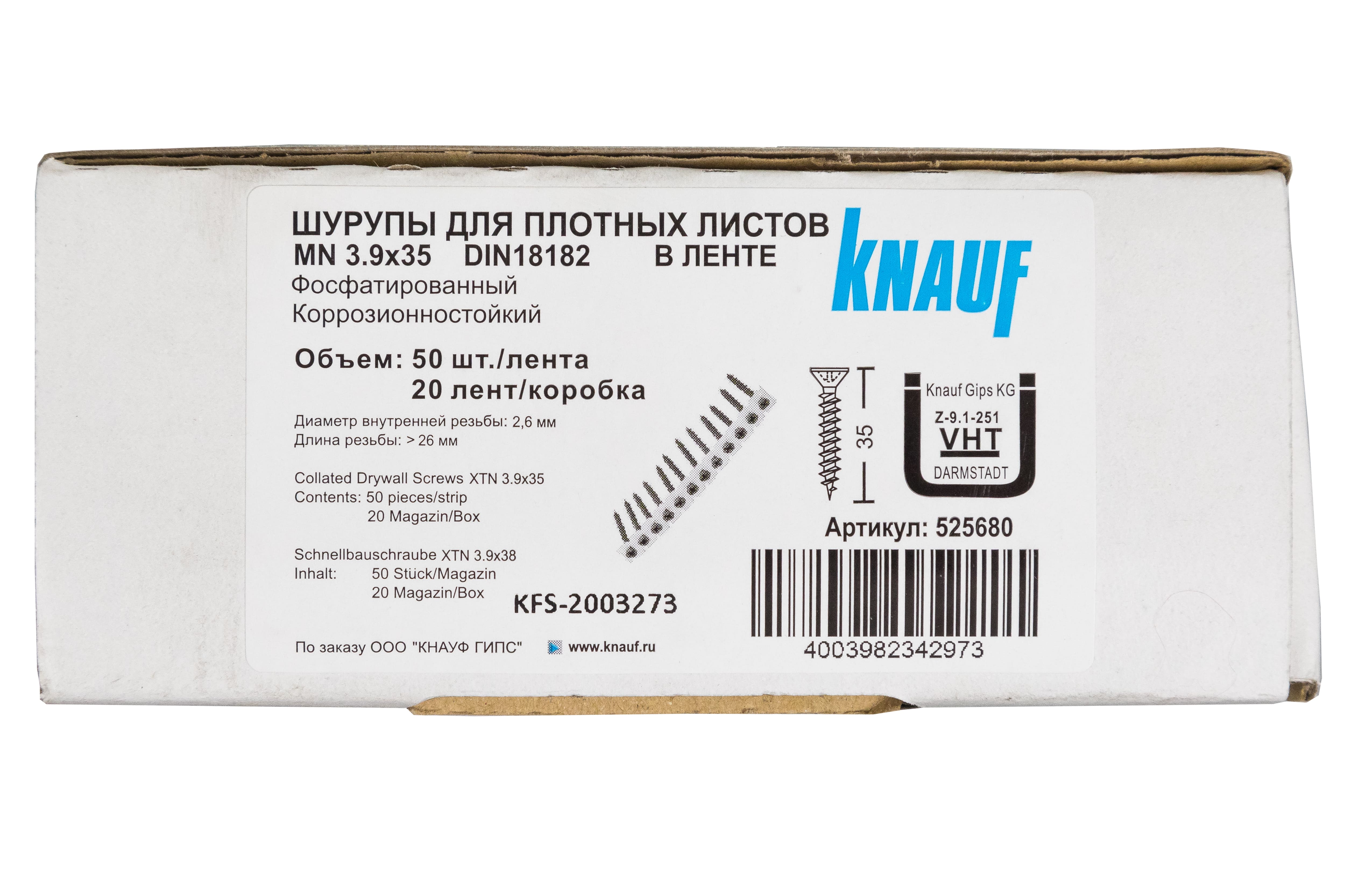 Брал шурупы Кнауф для ГВЛ MN 3,9x35 мм в лентах - упаковка - 1000шт, шурупы имеют полную резьбу, сделаны из стали с последующим оксидированием для защиты от коррозии.Шуруп служит для крепления Кнауф суперлистов к каркасу из дерева или стальных профилей толщиной 0,7мм