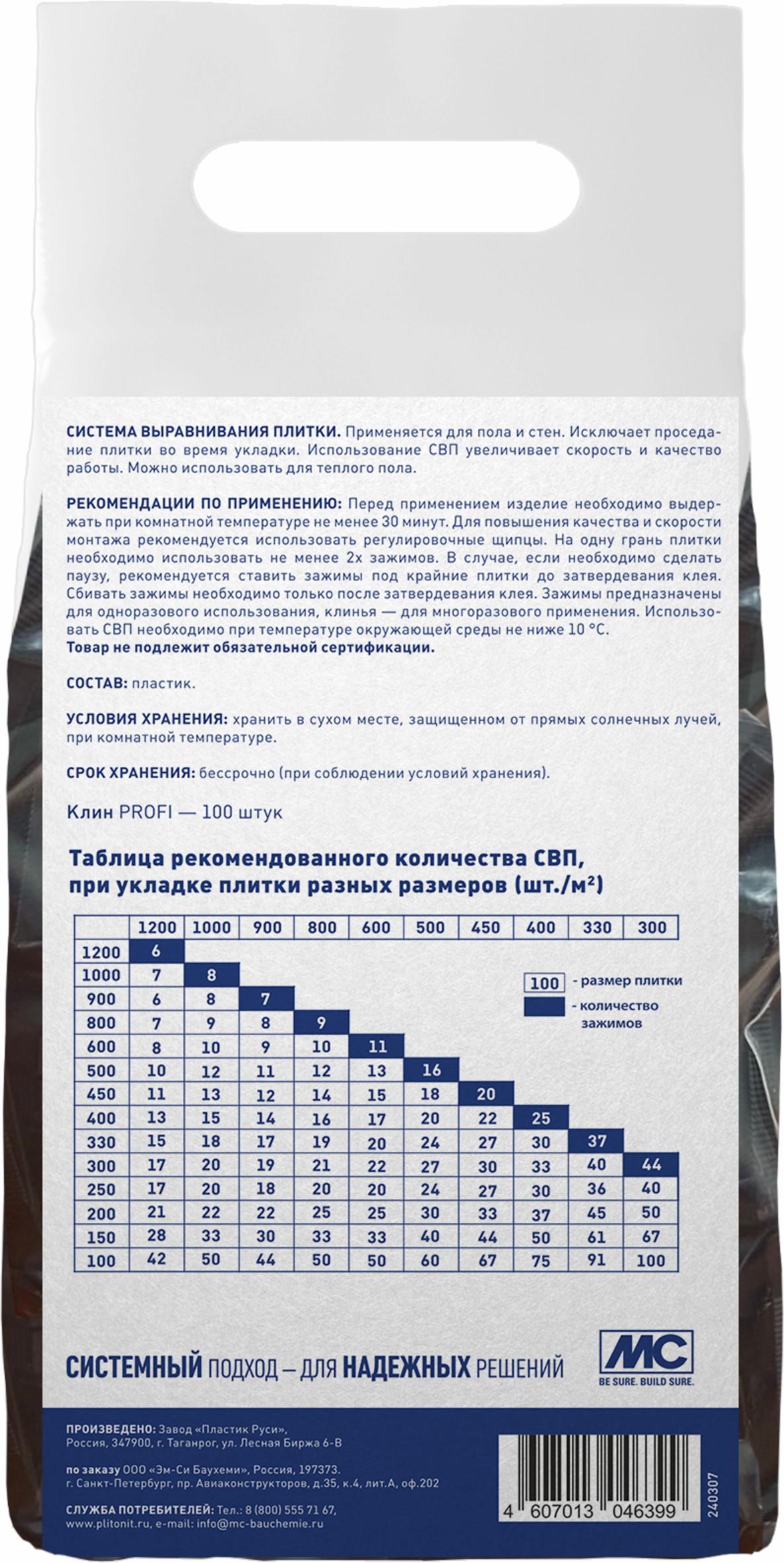 Преимущества СВП PLITONIT: Клин выполнен из высококачественного пластика и позволяет применять его многократно без деформации гребенки и ухудшения фиксирующих свойств, что дает мастеру экономичность в применении