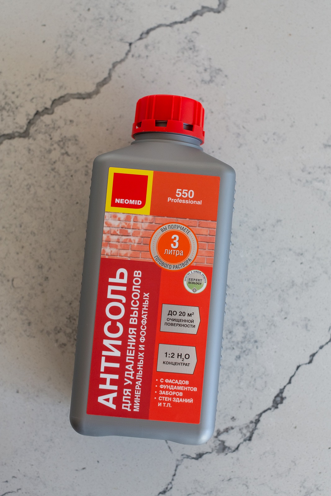 На кирпичной стене балкона проступили высолы. В Материке посоветовали приобрести Антисоль для удаления высолов производителя Neomid .Доступная цена, просто в применении, да к тому же NEOMID 550 – концентрат, что позволяет из 1 литра-получить 3 литра готового к применению раствора.
