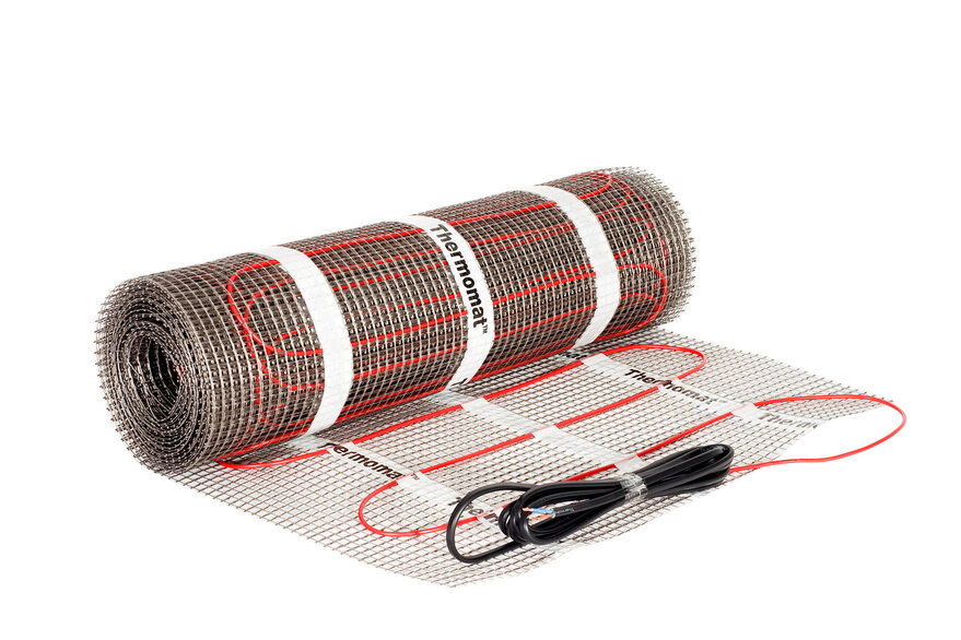 Thermomat – это тонкий двужильный нагревательный кабель толщиной всего 2,8 мм, закрепленный с определенным шагом на сетке шириной 50 см. Его толщина позволяет устанавливать его в слой плиточного клея без заливки стяжки, поэтому высота пола практически не увеличивается.