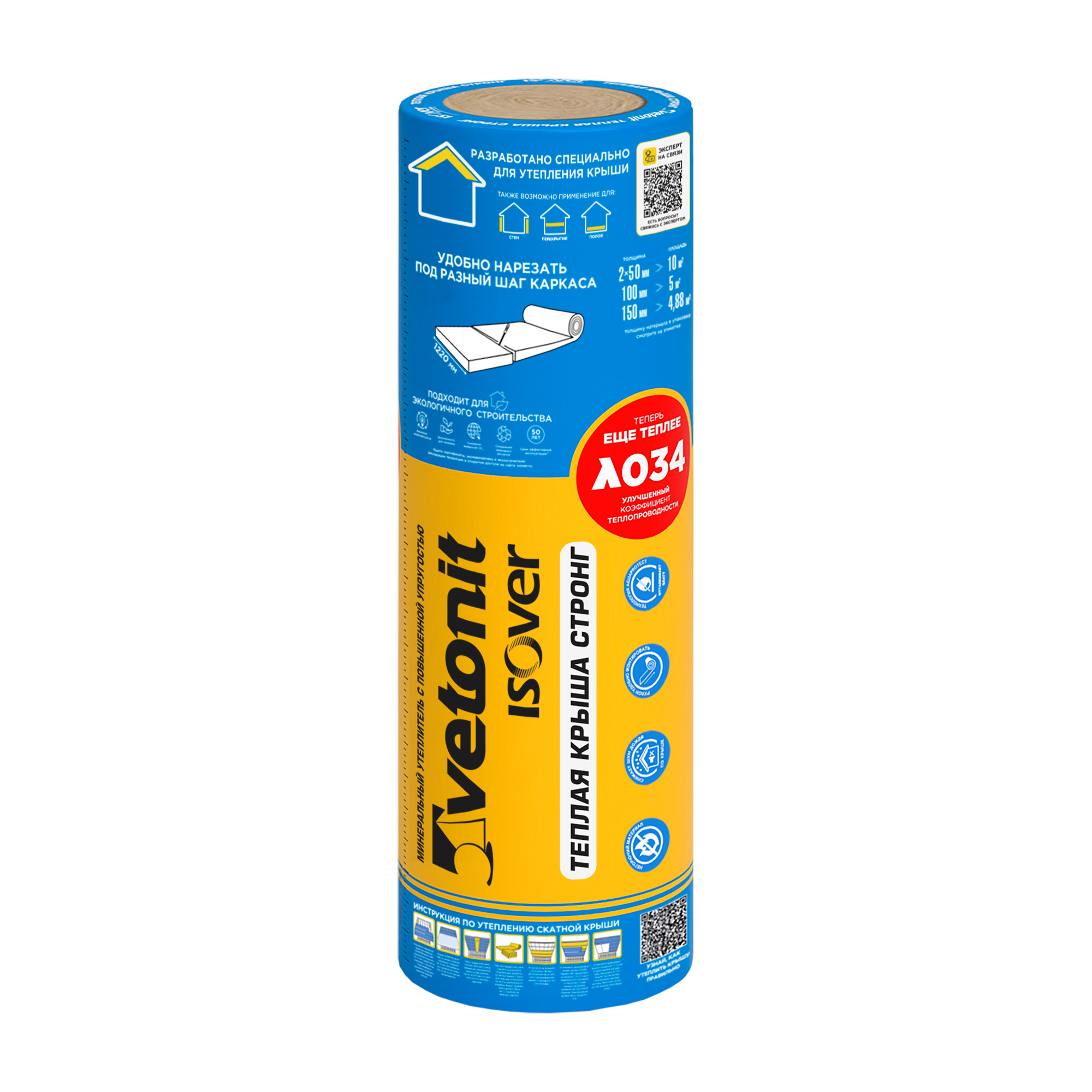 Ветонит (Изовер) Теплая крыша стронг – самая теплая (0.034 вт/(м*К)) и упругая минеральная вата в рулоне, разработанная специально для утепления и шумоизоляции скатных крыш и мансард.