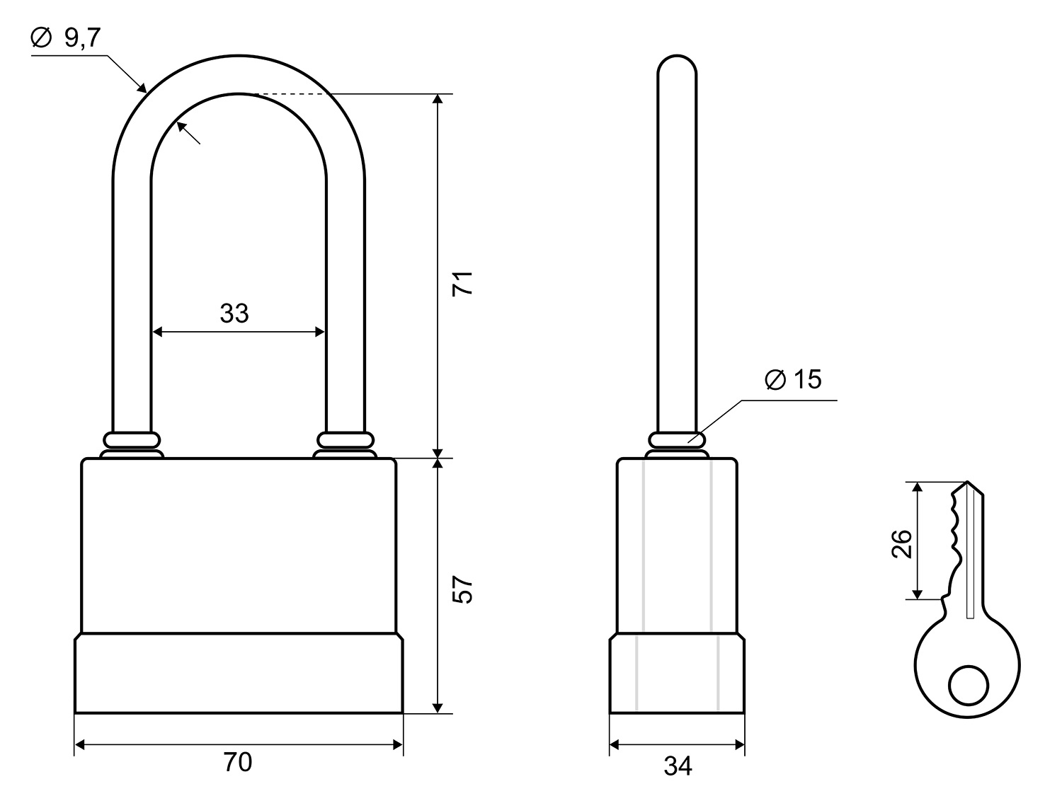 - Проем дужки 33x36 мм - взломостойкое отверстие (с учетом проушин)