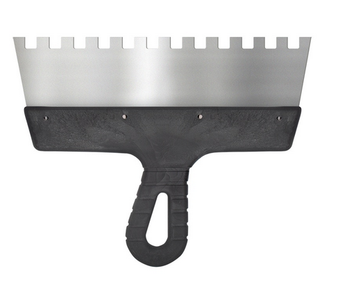 Предназначен для нанесения и распределения клеевых растворов и создания на их поверхности гребенчатой структуры при укладке керамической плитки, декоративного камня и др. Зубчатый шпатель служит для того, чтобы клеевая масса разравнивалась до одинаковой толщины слоя по всей площади материала без образования пустот.